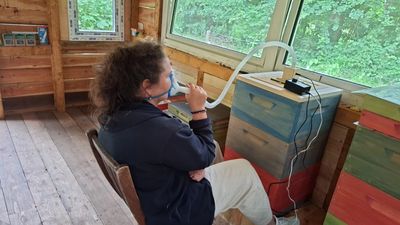 Das extra dafür entwickelte ApiAir Inhalationsgerät, saugt die Luft aus dem Bienenstock mit einem integrierten Ventilator an, reguliert den Luftstrom und wird dann durch die Maske inhaliert. Die von Ihnen ausgeatmete Luft gelangt nicht zu den Bienen zurück, sie wird nach Außen geleitet. Sie werden durch mehrere Sicherheitsgitter geschützt und haben keinen direkten Kontakt zu den Bienen - Sie sitzen neben oder hinter der Bienenbeute.